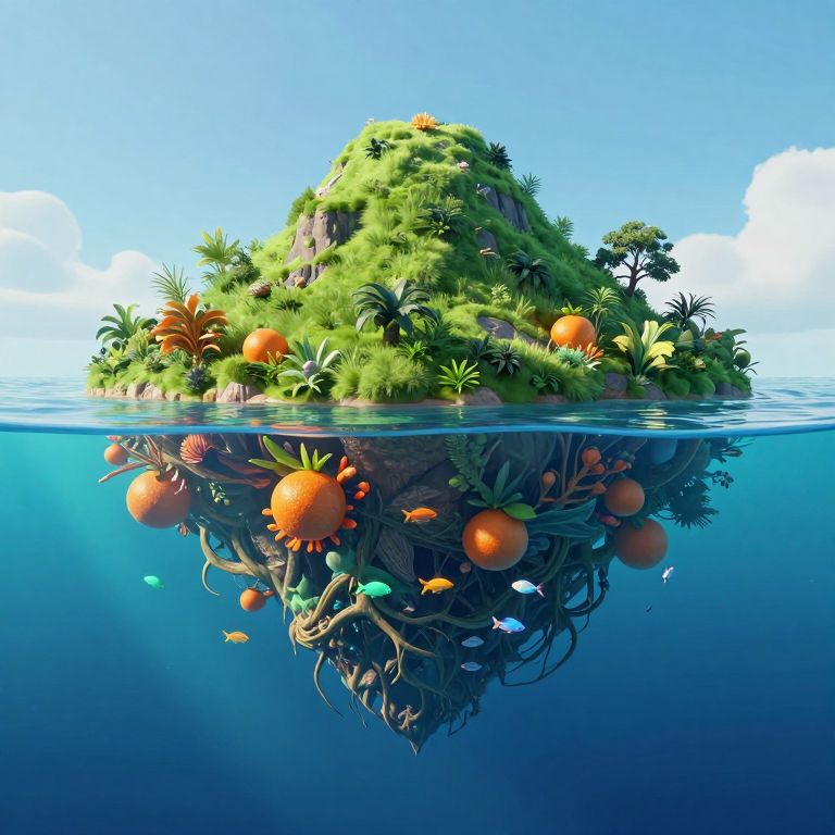 A surreal 3D-rendered island floats serenely under a clear sky, its lush green summit mirrored by an inverted underwater landscape where vibrant orange fruits bloom from the submerged roots, attracting schools of luminous fish in a dreamlike, high-definition digital art composition.
