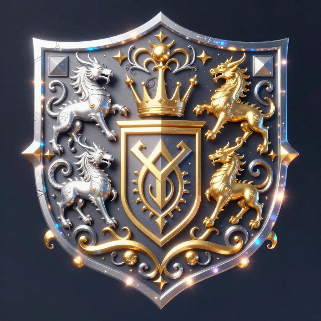 Futuristic family crest generator with holographic shields and swirling heraldic designs, mythical beasts and scrollwork patterns in gold and silver, user crafting a personalized emblem digitally, shimmering magical aura, blending medieval symbolism with advanced tech visuals.