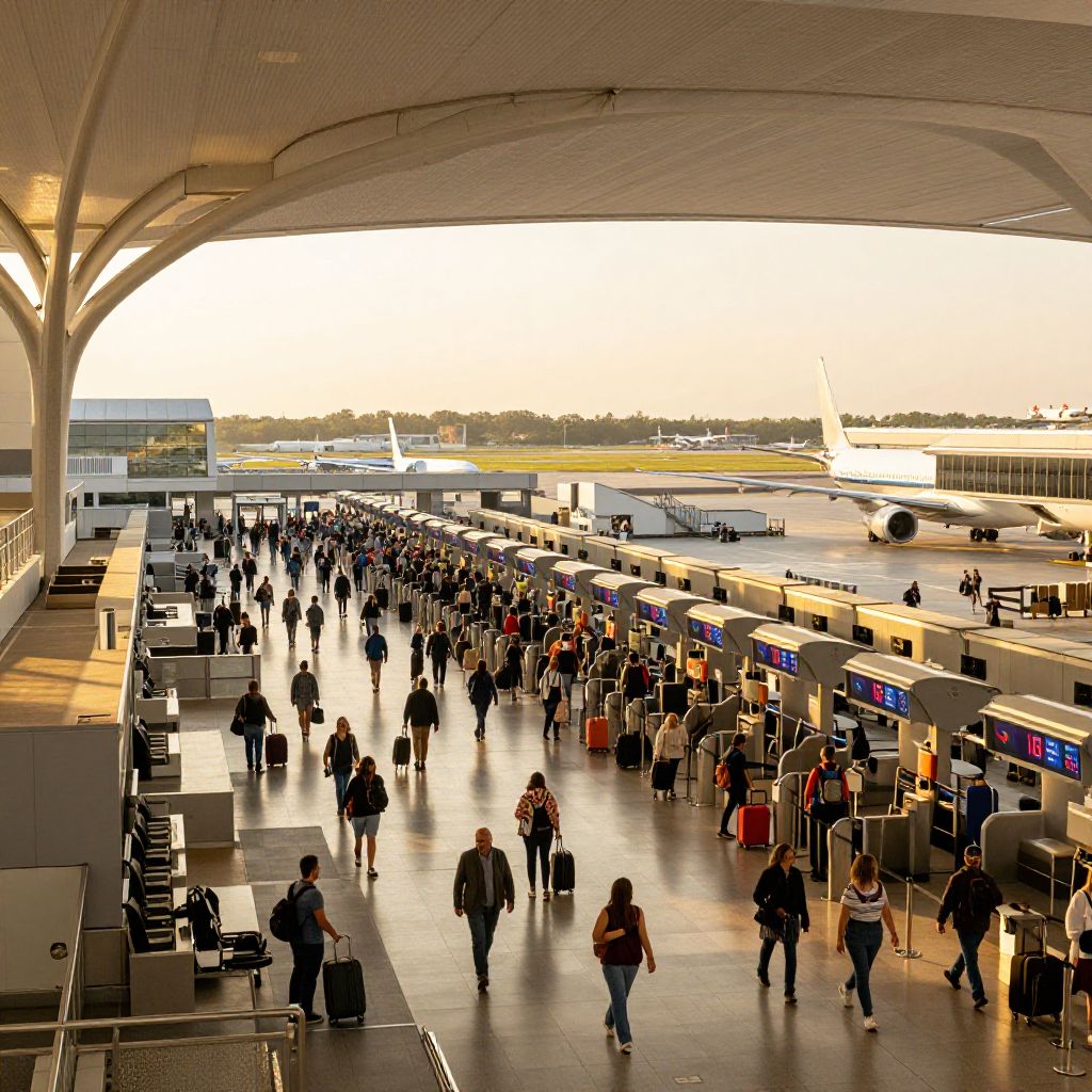 Photograph of a busy airport terminal with sunlight streaming in, showing numerous travelers with luggage at check-in counters and security gates.