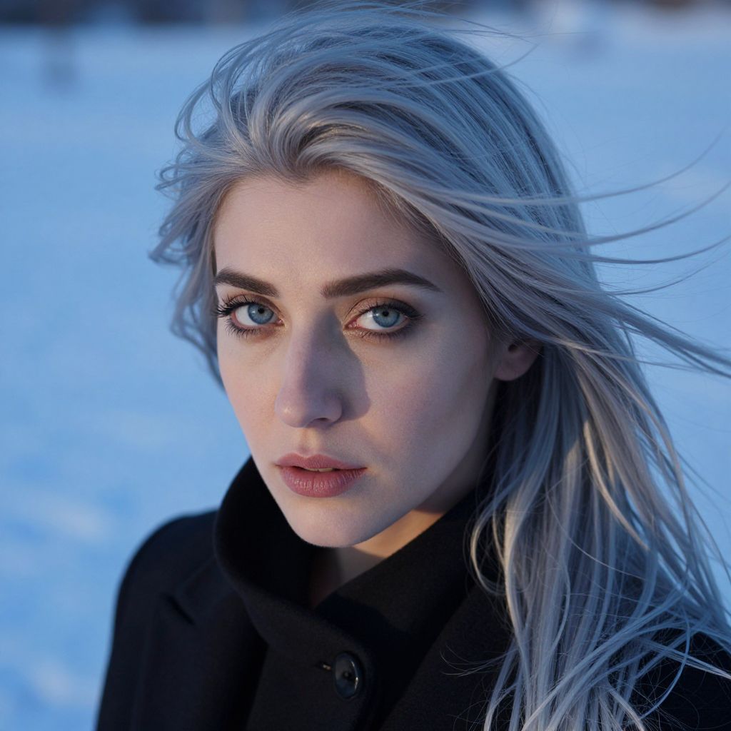 Photograph of a young woman with strikingly pale skin, long, silver-blonde hair blowing in the wind, and intense blue eyes. She wears a black coat and gazes directly at the camera with a serious expression. The background is a bright blue, suggesting a snowy landscape. Her makeup is minimal, highlighting her natural beauty and sharp features. The image has a realistic, high-definition quality, capturing the cold, wintry atmosphere and the contrast between her pale complexion and the dark coat against the blue background.