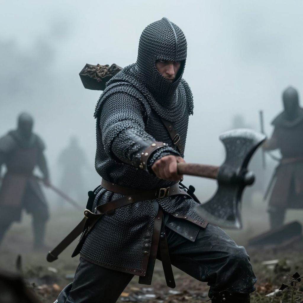 Dynamic axe pose frozen in time, a medieval soldier in chainmail lunging forward, misty battlefield environment, sharp focus on weapon and determined face, moody and atmospheric.