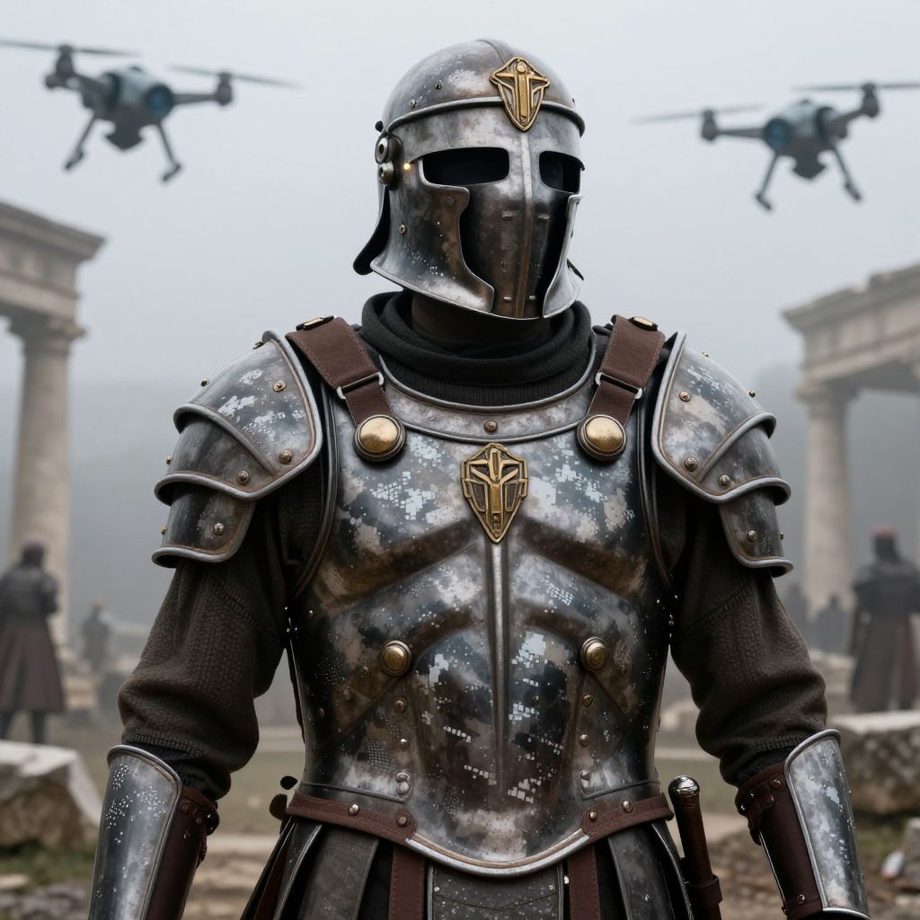 Detailed close-up of modern Roman armor showing metallic plates with digital camouflage patterns, futuristic fastenings, and illuminated crest, worn by a soldier on a foggy ancient Roman ruins battlefield enhanced with robotic drones hovering nearby.