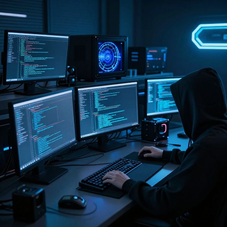 Computer hacker room setup, dimly lit with multiple glowing monitors displaying code, futuristic tech gear scattered, neon-blue ambient lighting, cyberpunk style, detailed and immersive