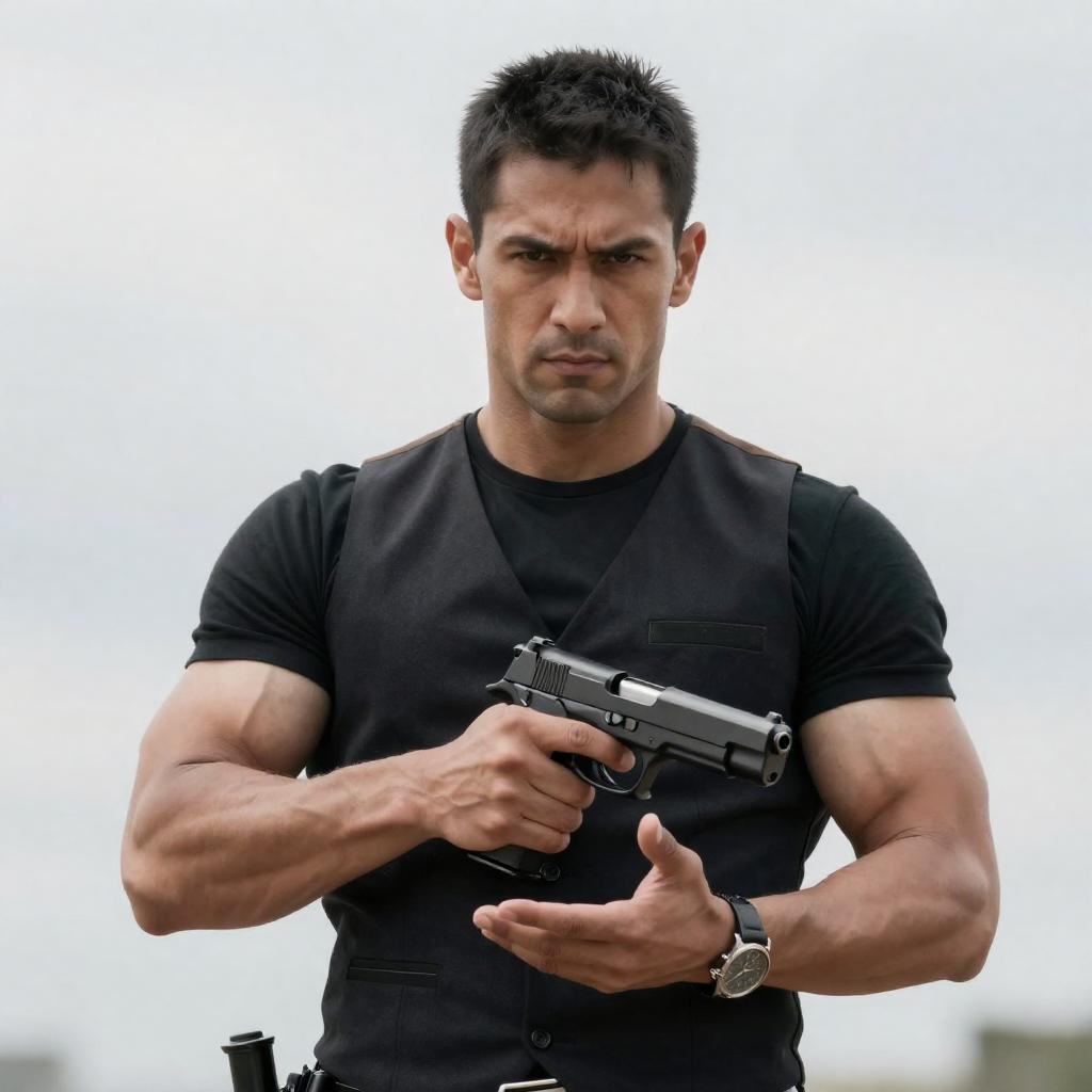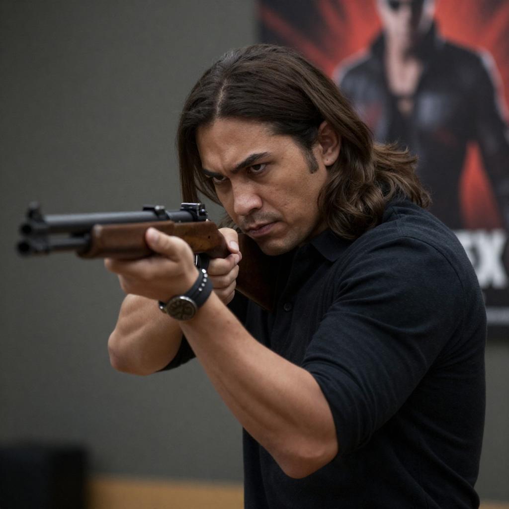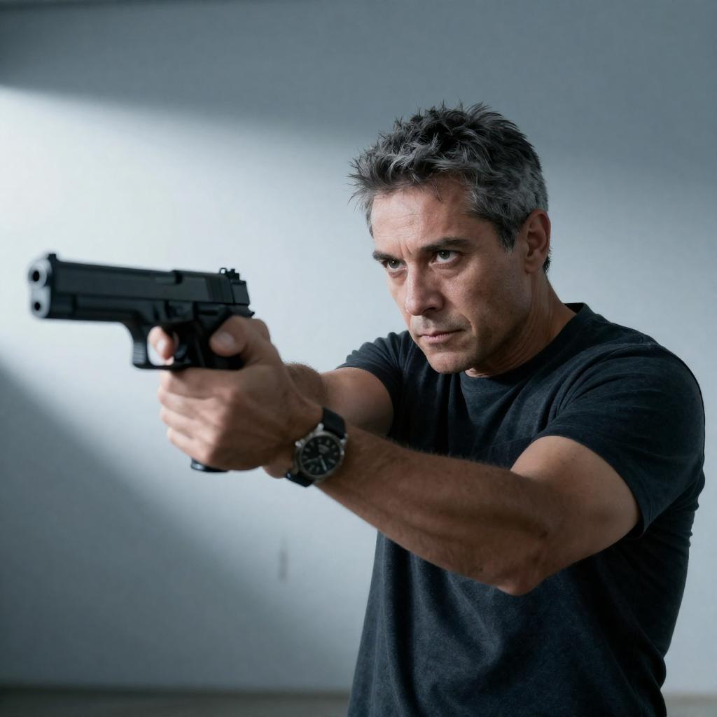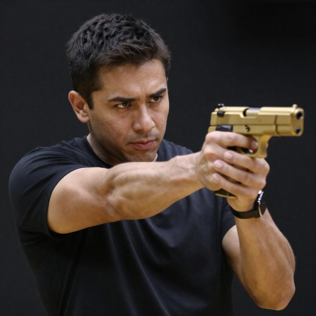 Photograph of a man with short dark hair and light skin, wearing a black shirt, aiming two gold-colored handguns with both hands. He has a focused expression, with intense eyes and slightly parted lips. The background is dark and blurred, emphasizing the subject. The man's right arm is extended forward, while his left arm is slightly bent.