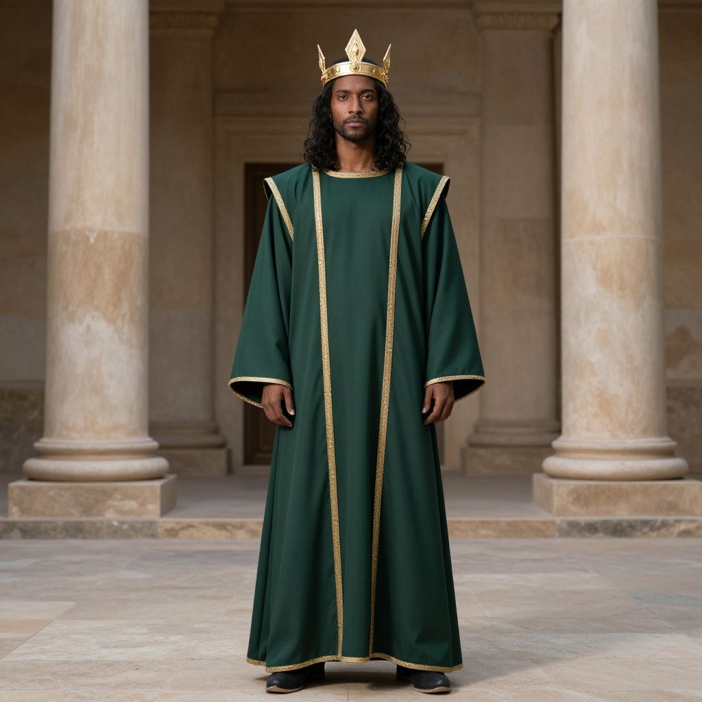 Gilgamesh Eternals Costume, man in a green robe and a gold crown standing in front of pillars