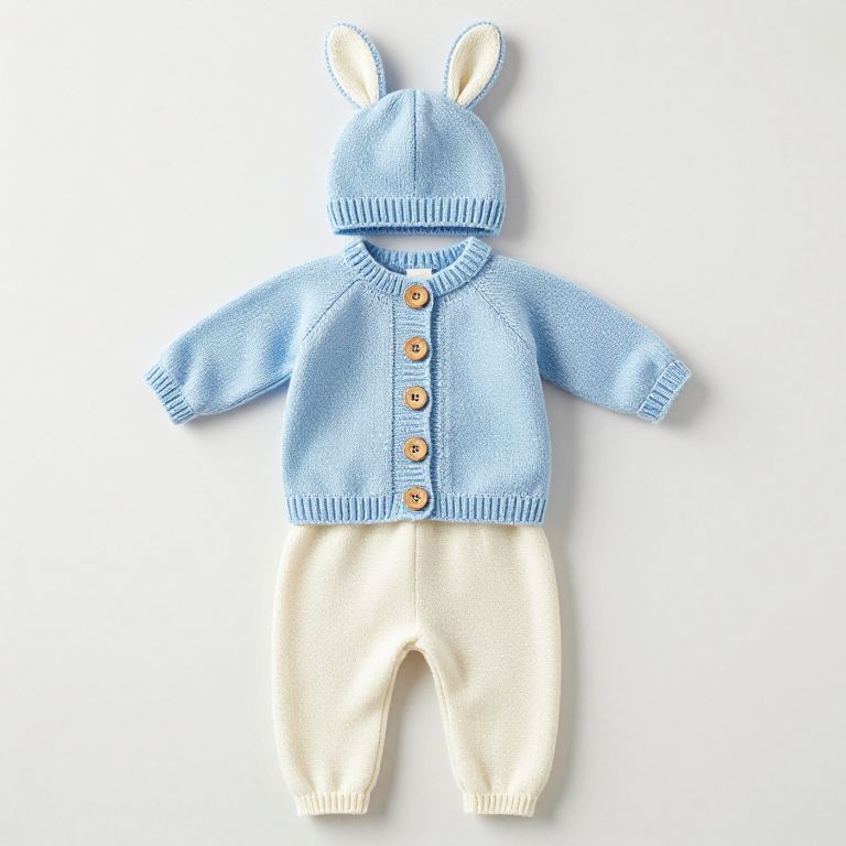 Hand-knit newborn baby outfit featuring a light blue top with five wooden buttons, cream-colored pants, and a matching hat with two upright bunny ears, part of the Faire - The Blueberry Hill Bailey Bunny Set.