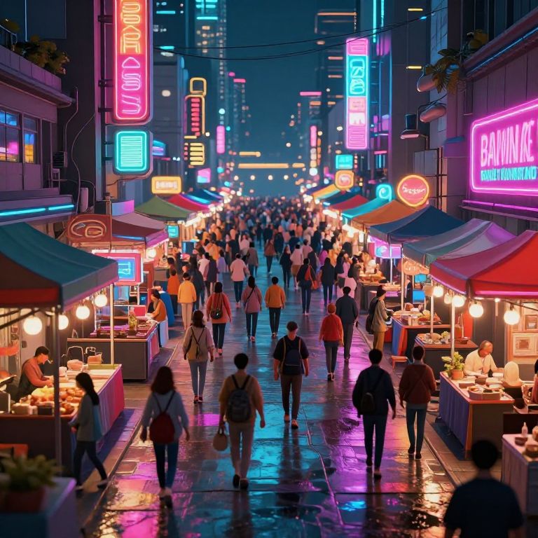 Make any image 3d style of a futuristic cyberpunk street market at night, neon lights reflecting on wet pavement, dense crowd layered in various depths, creating a vivid and dynamic three-dimensional urban scene with rich colors.