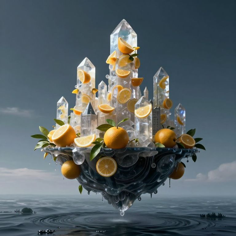 Citrus-infused skyscrapers emerge from a bed of vibrant oranges and lemons, suspended above a rippling sea of dark ink, as if gravity itself is dictated by the aromatic essence of the fruit-laden city.