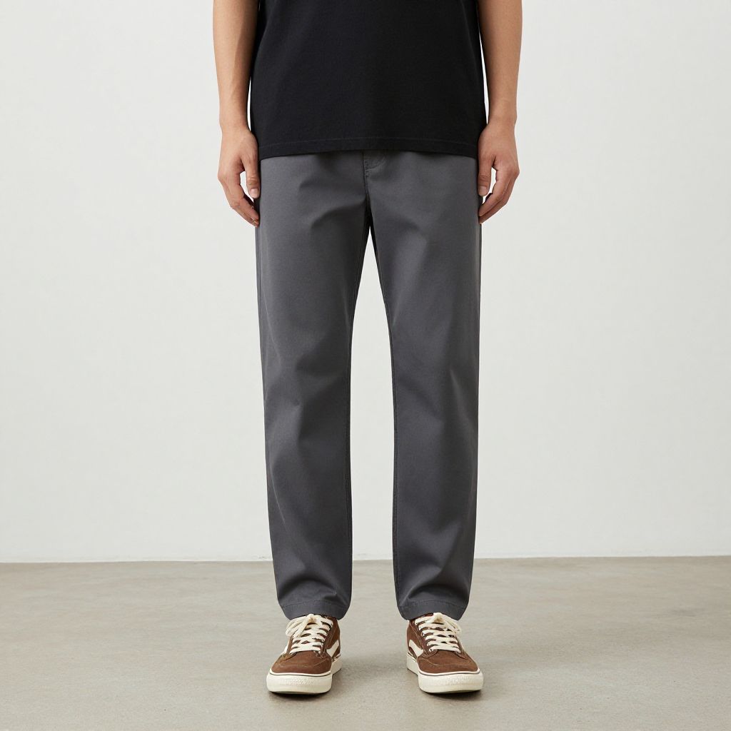 Man wearing a black t-shirt and gray pants with brown shoes.