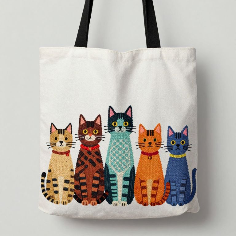 Colorful tote bag featuring five cartoon cats with diverse stripes and colors, standing in a row, against a white background.