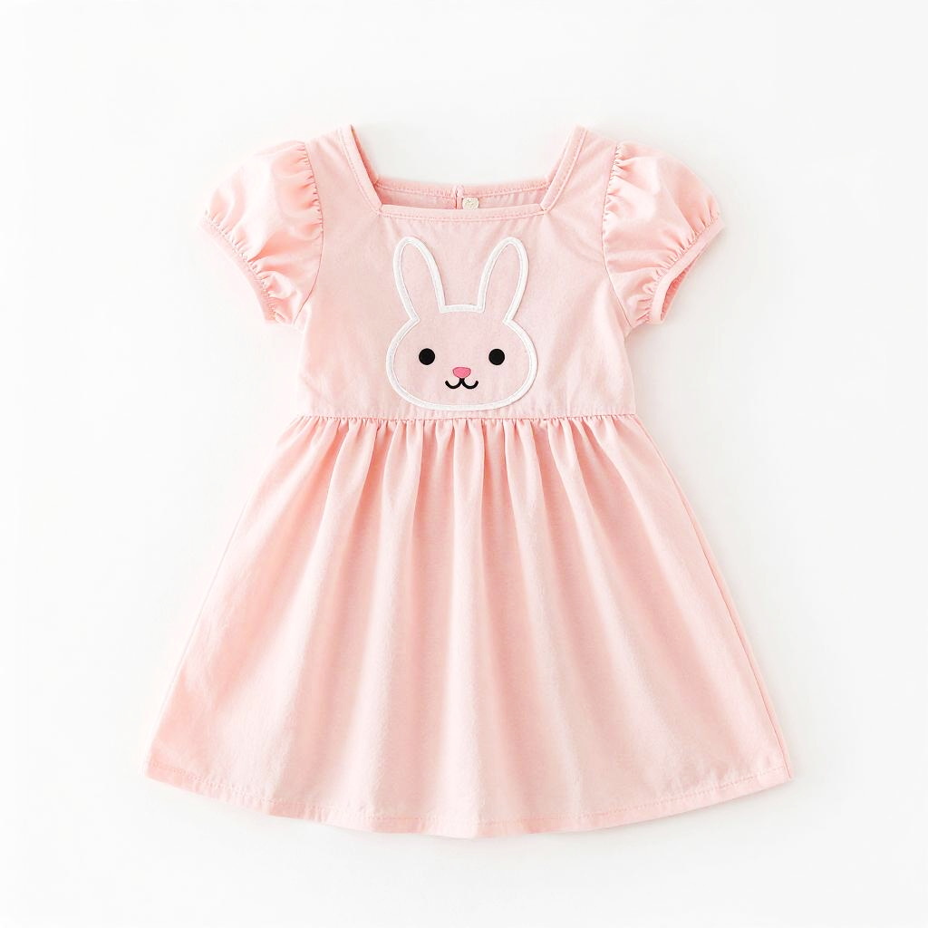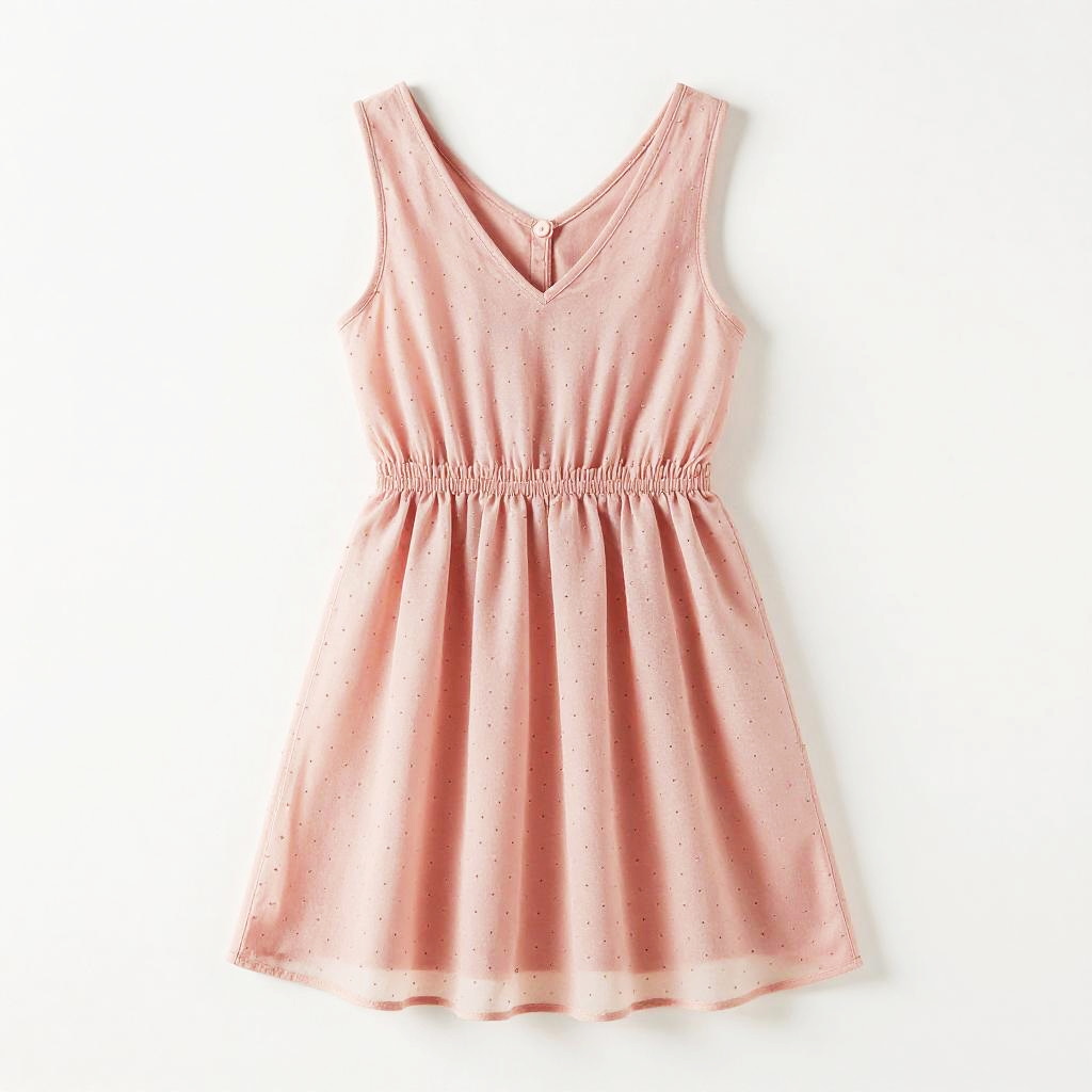 This is a photograph of a pink, sleeveless, V-neck dress. The dress is made of a lightweight, slightly sheer fabric with small, scattered polka dots. It has a gathered waist that flares out into a short, A-line skirt. The dress is centered against a plain white background, making it the clear focal point of the image. The overall style is cute and feminine.