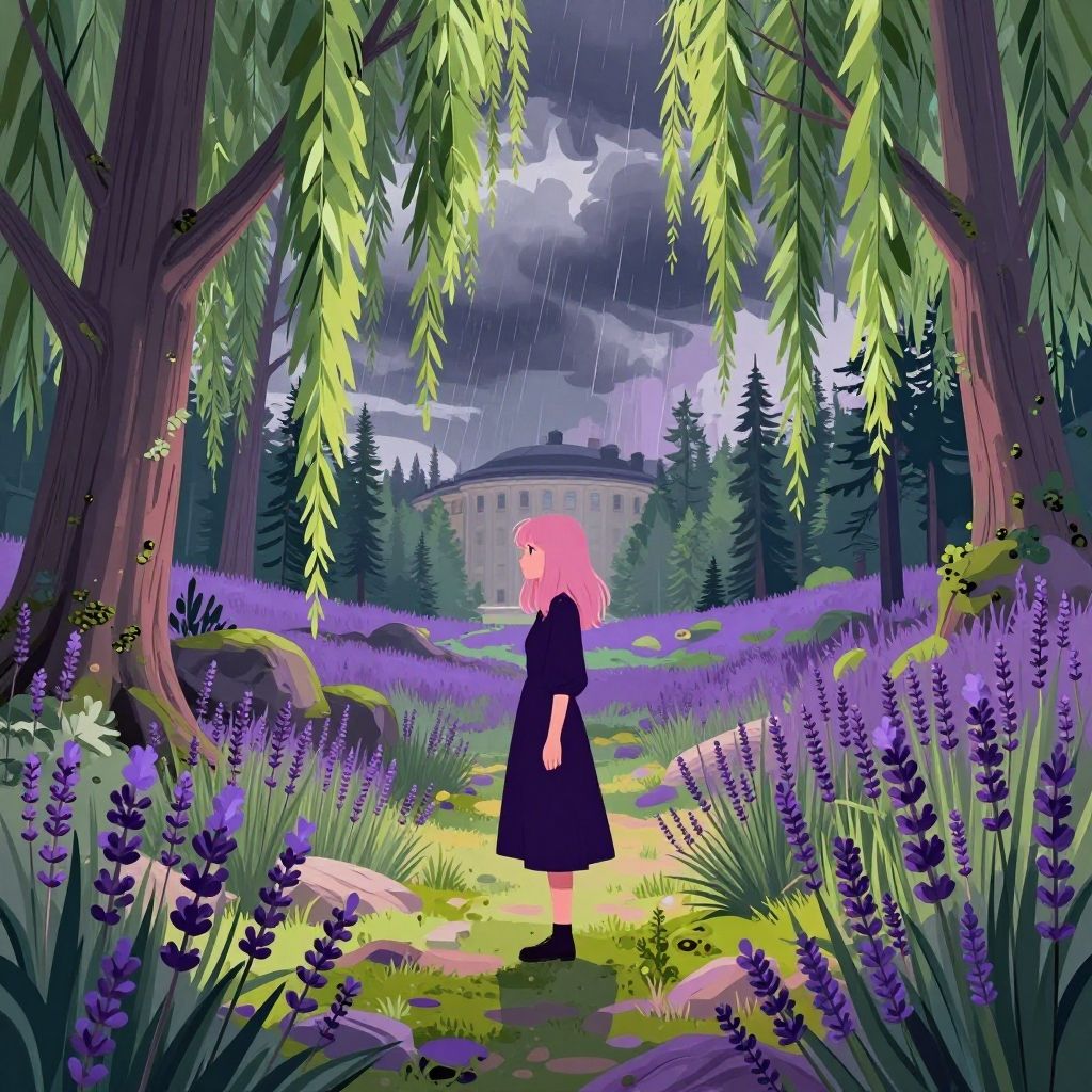 1girl, grand Vector Art, insane details, side-profile of a Pastel Goth Art Hesitant ("Silent footfalls on mossy paths, a communion with nature's secrets, awakening our connection to the earth.":1.3), inside a [Striking:Hyperdetailed:18] Helsinki, Lavender jungle with Willow, Stormy weather, Very wide view, Realistic, Sci-Fi, Neo-Expressionism, Warm lighting, Low shutter, Colorful, symbolism, stylized, pixiv, dslr, (designed by Tetsuya Ishida:1.0), (Ryohei Fuke:1.2), (Loish:0.7), (Don Blanding:1.0)