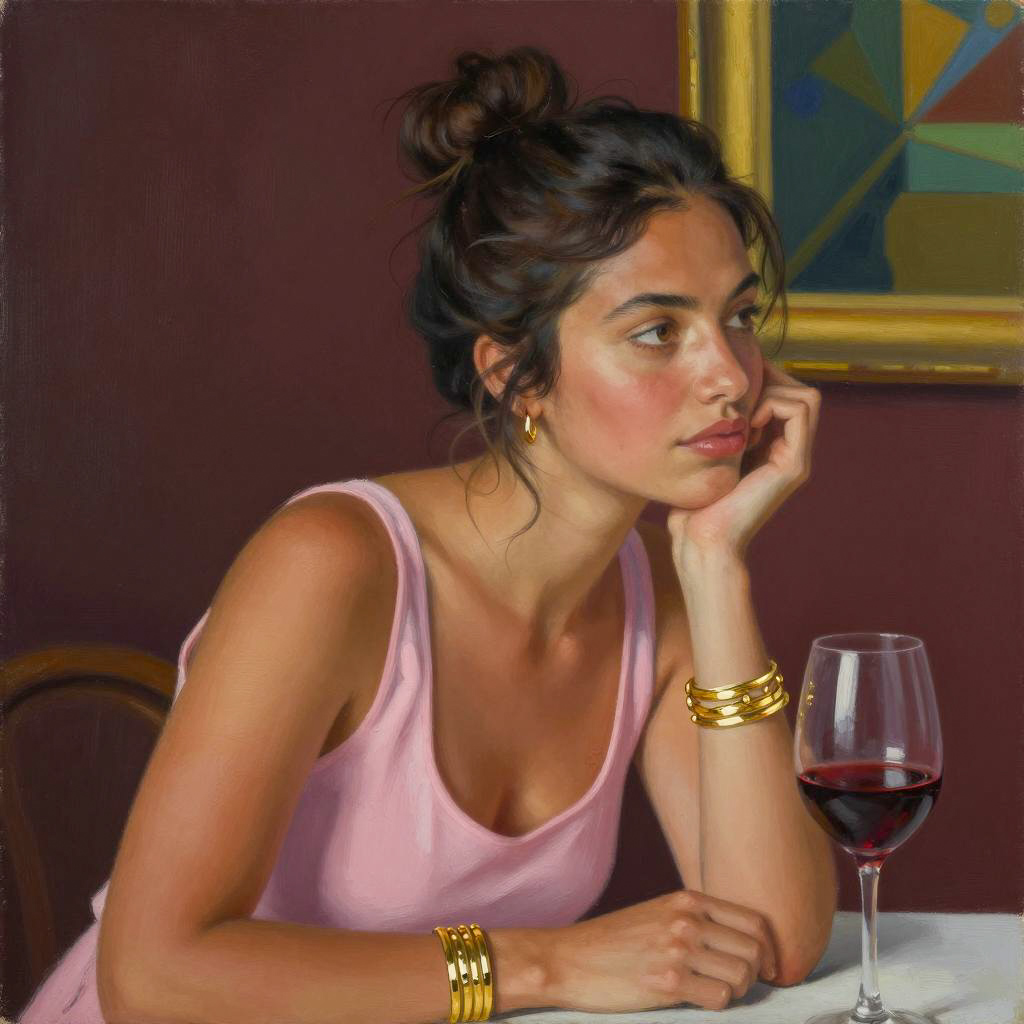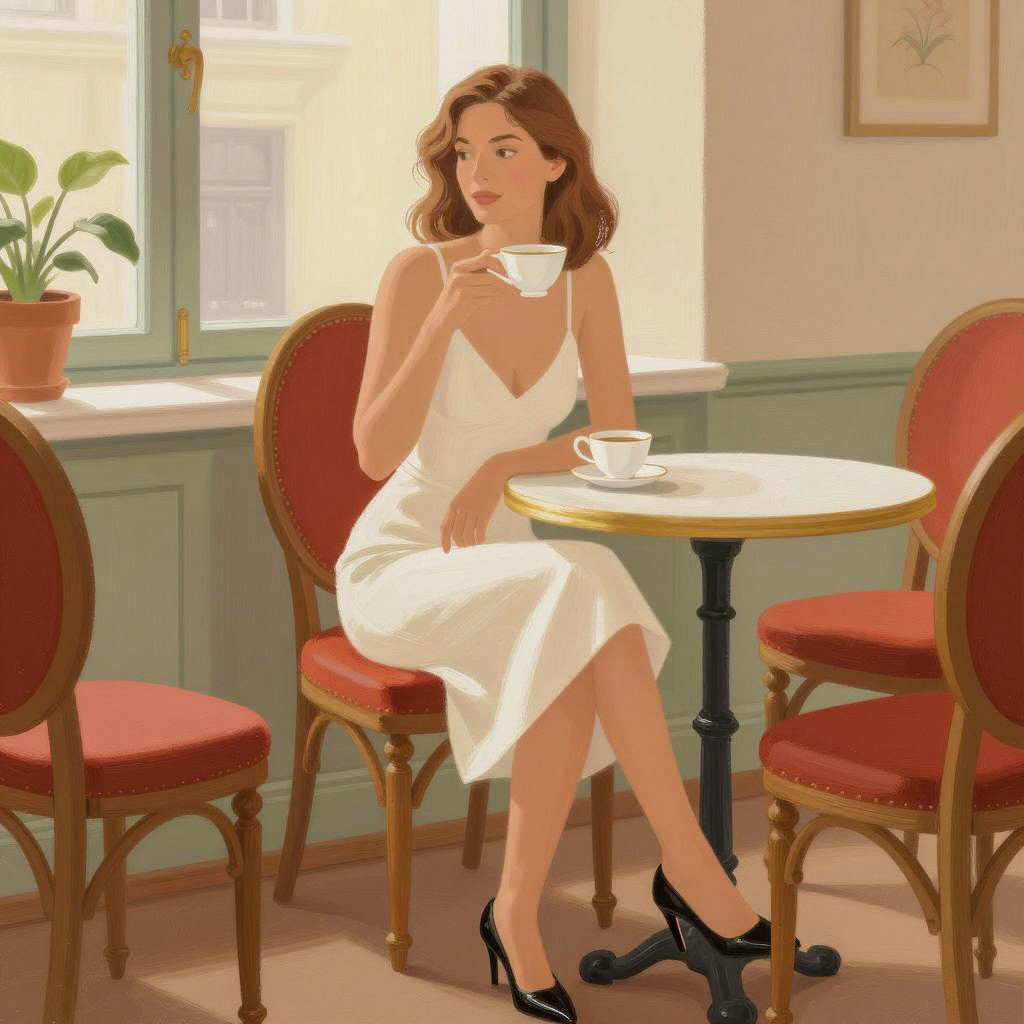 Illustration of a woman with fair skin and dark hair in an updo, wearing a yellow dress with long sleeves, sitting on a green velvet chair. She rests her chin on her hand, looking down. A round table beside her holds a white teapot and cup. The background is a yellow-green wall. The style is impressionistic with bold, ured brushstrokes. The woman has a calm, introspective expression.