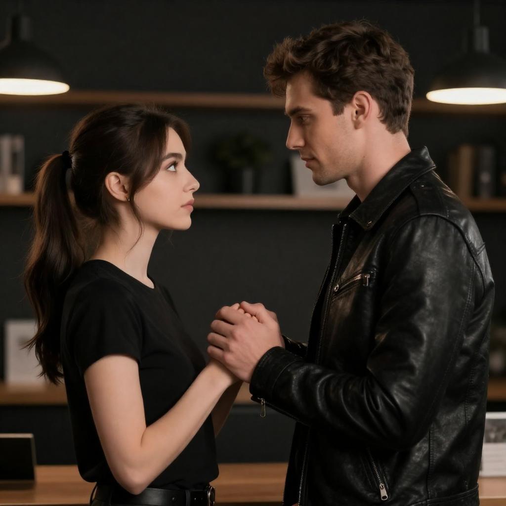 Photograph of a man and woman in an office setting. The man, with short brown hair, beard, and pinstripe suit, gazes intently at the woman. The woman, with brown hair in a ponytail, black suit, and pale skin, looks up at him with a neutral expression. The man's hand rests on her shoulder. Wooden wall and gray ured background. Both have intense eye contact.