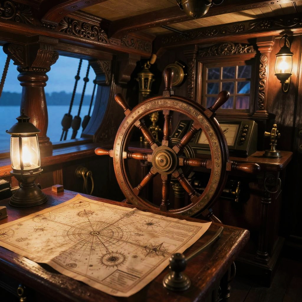Photograph of a dimly lit, vintage-style ship's cabin. Central focus is a large, ornately carved wooden ship's wheel with brass accents. To the left, a glowing lantern casts a warm light on a detailed, yellowed nautical chart spread on a polished wooden table. The background shows a window revealing a blue twilight sky and ship masts outside. The cabin has rich, dark wood paneling with intricate carvings. A framed picture and another lantern are partially visible on the right. The overall ambiance is warm and nostalgic, evoking a sense of maritime adventure.