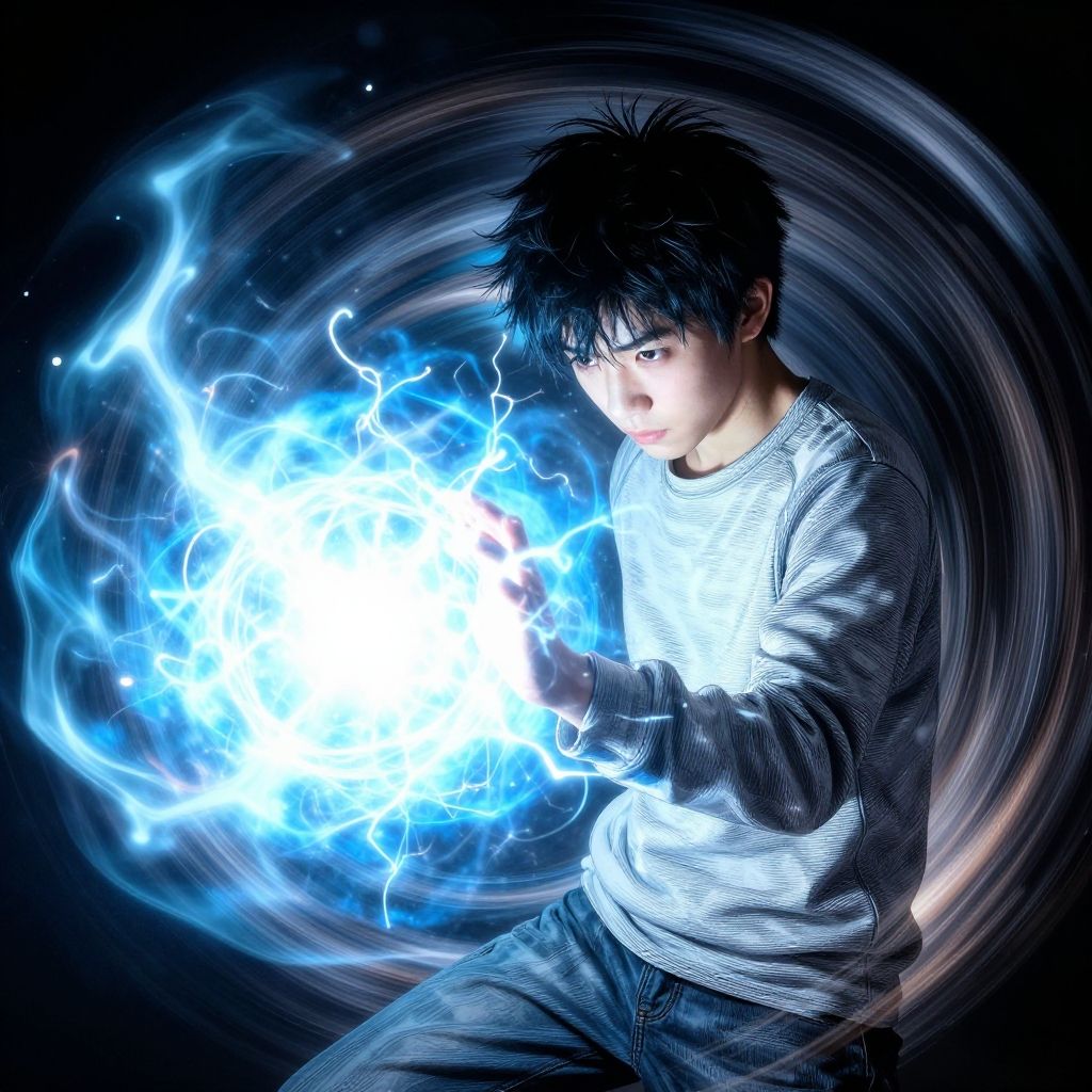 Anime-style drawing of a serious young man with black hair, wearing a white sweater, conjuring a glowing, electric orb with bright yellow lightning against a