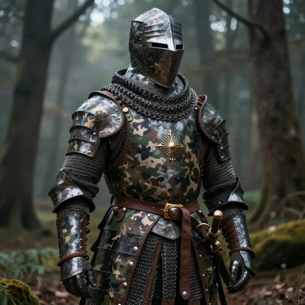 Photograph of a medieval knight in shiny, patterned armor with chainmail, standing in a misty, dense forest. Armor features camo-like