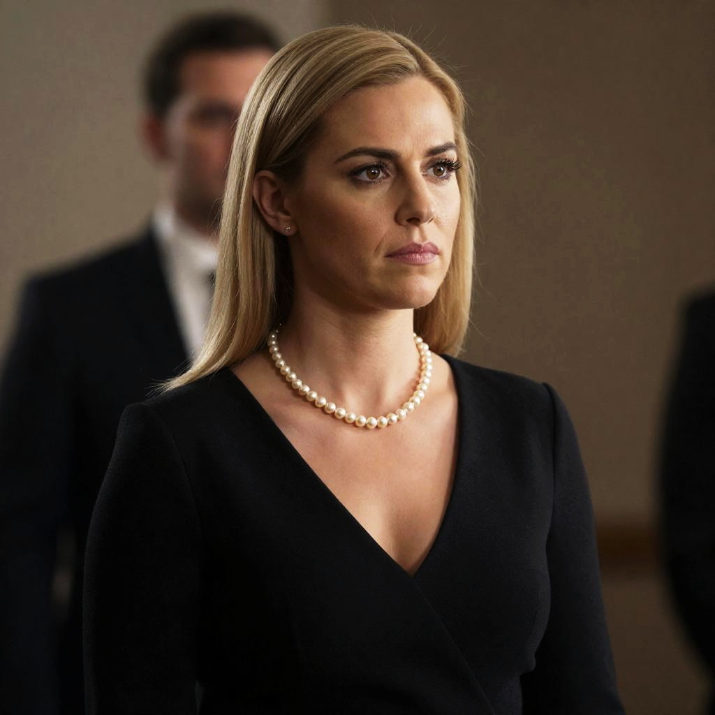Blonde woman with wavy hair, wearing a red blazer over a navy and white striped shirt, standing outdoors. Blurred background with white and blue tents, green grass, and white railings. Neutral facial expression, slightly open mouth. One person.