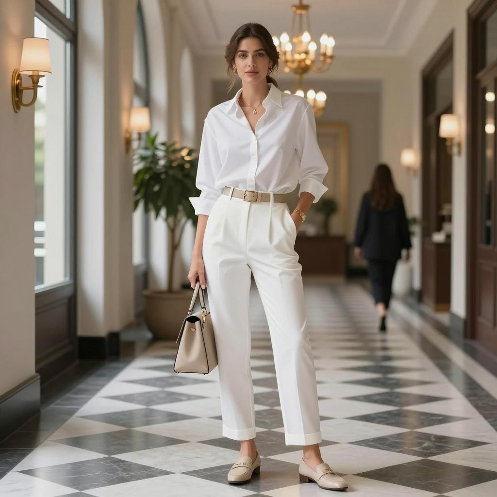 Classy summer outfit woman, photorealistic, female model, standing, white blouse, white shorts, straw hat, brown belt, beige sandals, long brown hair, green eyes, smiling, classical colonnade background, checkered floor, potted plants, daytime, sunny, elegant, fashion photography, front view, symmetrical composition