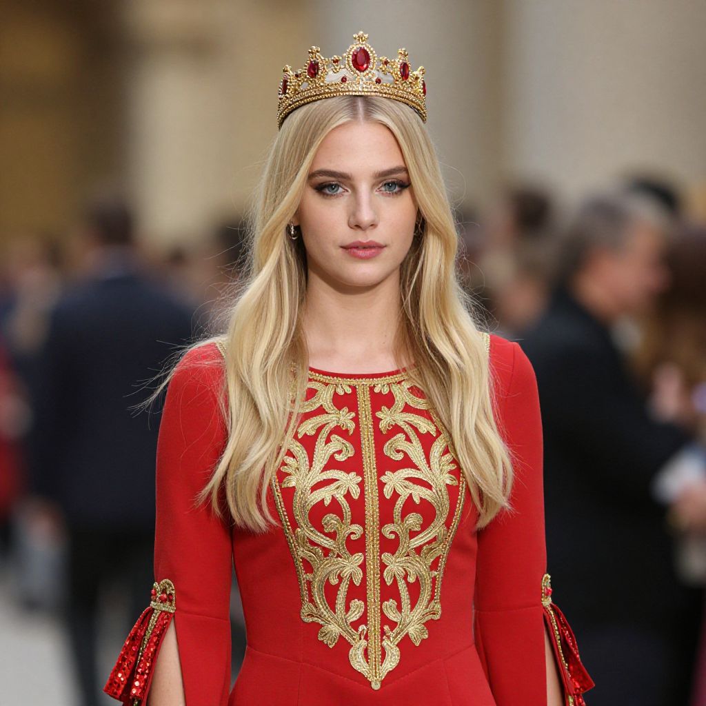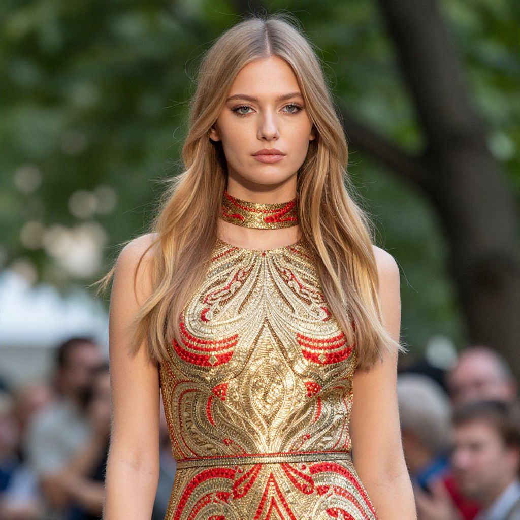Female model with long blonde hair, wearing a gold and red patterned sleeveless dress with a choker neckline. The background is blurred, with trees and other people in the distance.