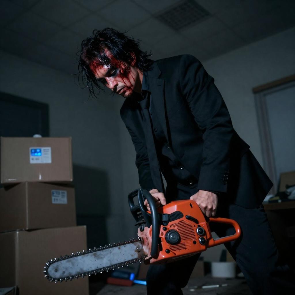 Man with bloody face and wild hair, wearing black suit, holding red chainsaw, leaning forward in dimly lit, cluttered room. Boxes and blue light in background. Intense expression. Chainsaw in right hand. Ceiling grid above.