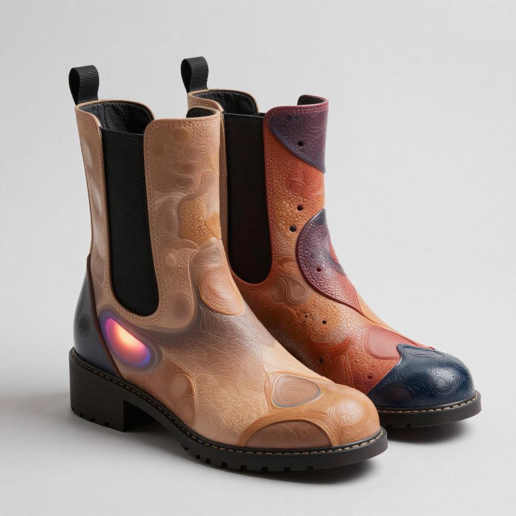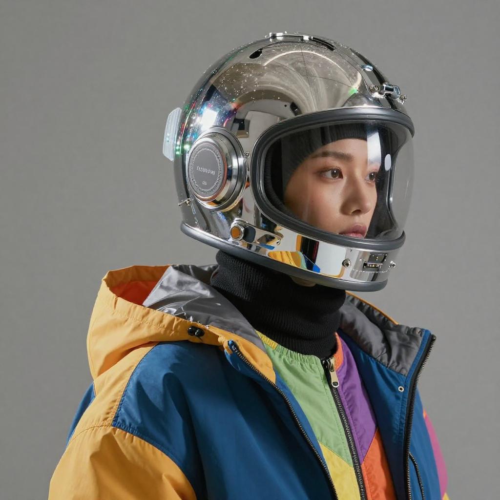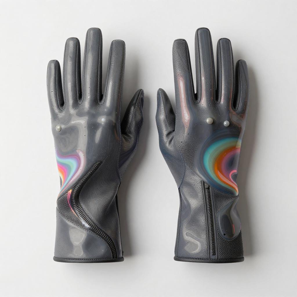 Experimental fashion concept featuring futuristic gloves, designed with liquid metal surfaces. The piece includes vivid colors, abstract lighting, and unconventional textures for an ultra-modern and high-concept look.