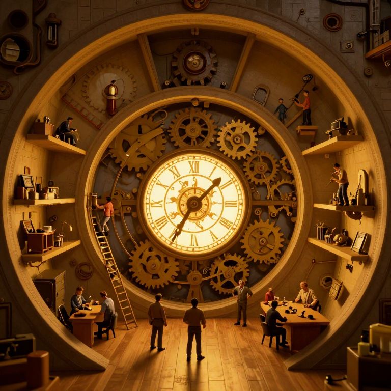 The image depicts a surreal, circular room that resembles a giant clockwork mechanism, with numerous small figures engaged in various activities. The room is divided into sections by a series of arches, each containing a different scene. At the center, a large, glowing clock with intricate gears and cogs is the focal point, surrounded by a group of people working on it. To the left, a figure is seen climbing a ladder, while another is seated at a desk. On the right, a person is standing on a platform, and another is seated at a table. The floor is wooden, and the walls are adorned with various objects and tools, contributing to the mechanical ambiance. The lighting is warm, casting a cozy glow over the scene, and the overall composition is balanced, with figures and objects arranged in a harmonious manner.