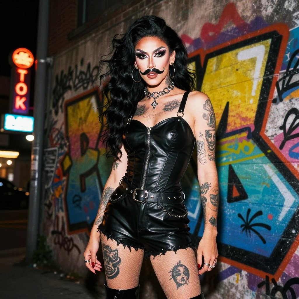 Drag queen with mustache, edgy urban streetwear, graffiti wall backdrop, vibrant graffiti colors, fierce attitude, detailed tattoos, nighttime cityscape with neon signs
