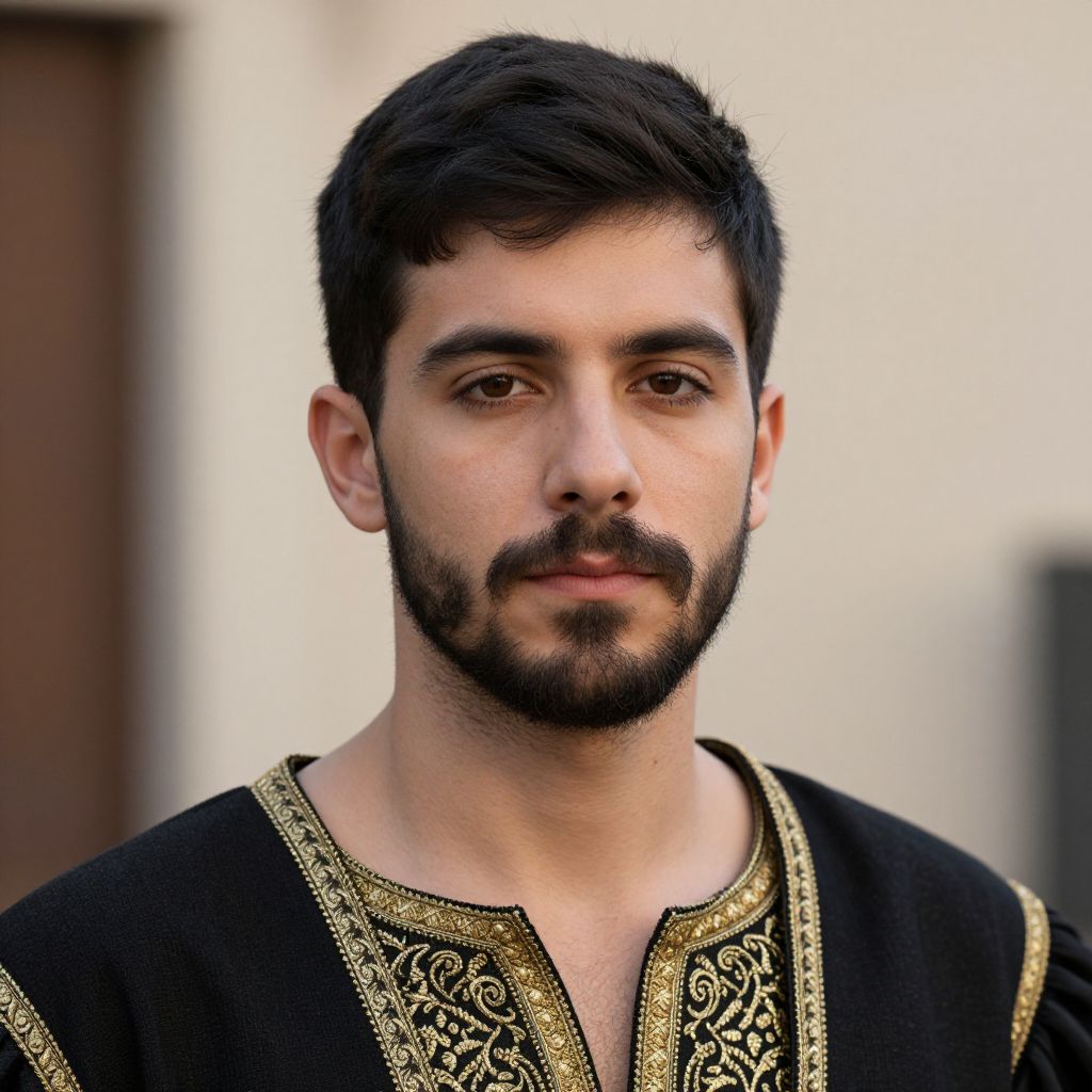 Photograph of a young Middle Eastern man with olive skin and dark brown eyes, wearing a black traditional garment with intricate gold embroidery on the neckline. He has short, dark, slightly wavy hair, a neatly trimmed beard, and a calm, neutral expression. The background is blurred, featuring a light-colored wall and a brown door, suggesting an outdoor setting. The man's attire and appearance convey a traditional, cultural style. The lighting is natural, highlighting his facial features and the texture of his clothing.