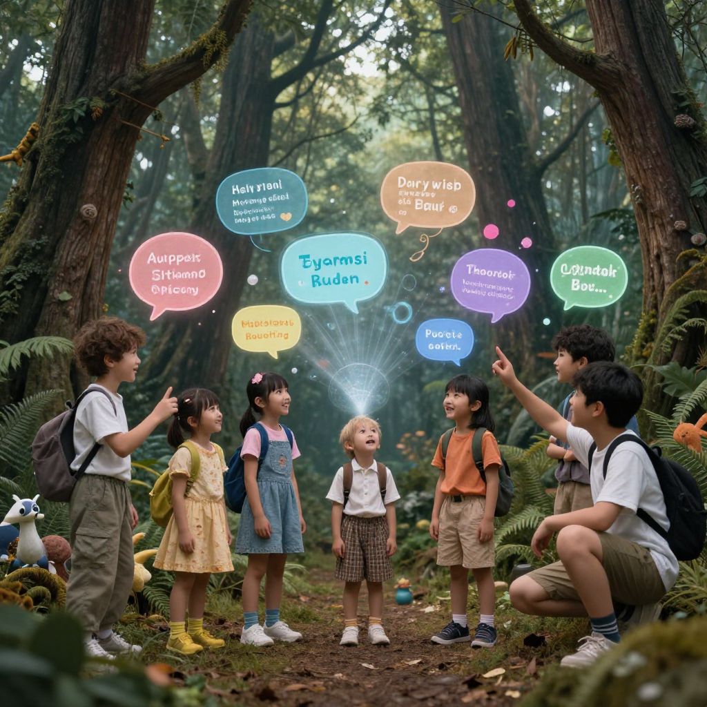 AI prompts for kids photography: A magical forest scene where children are posing with enchanted creatures, guided by an AI-powered photo companion that projects colorful, interactive prompt ideas in the air using animated text bubbles.