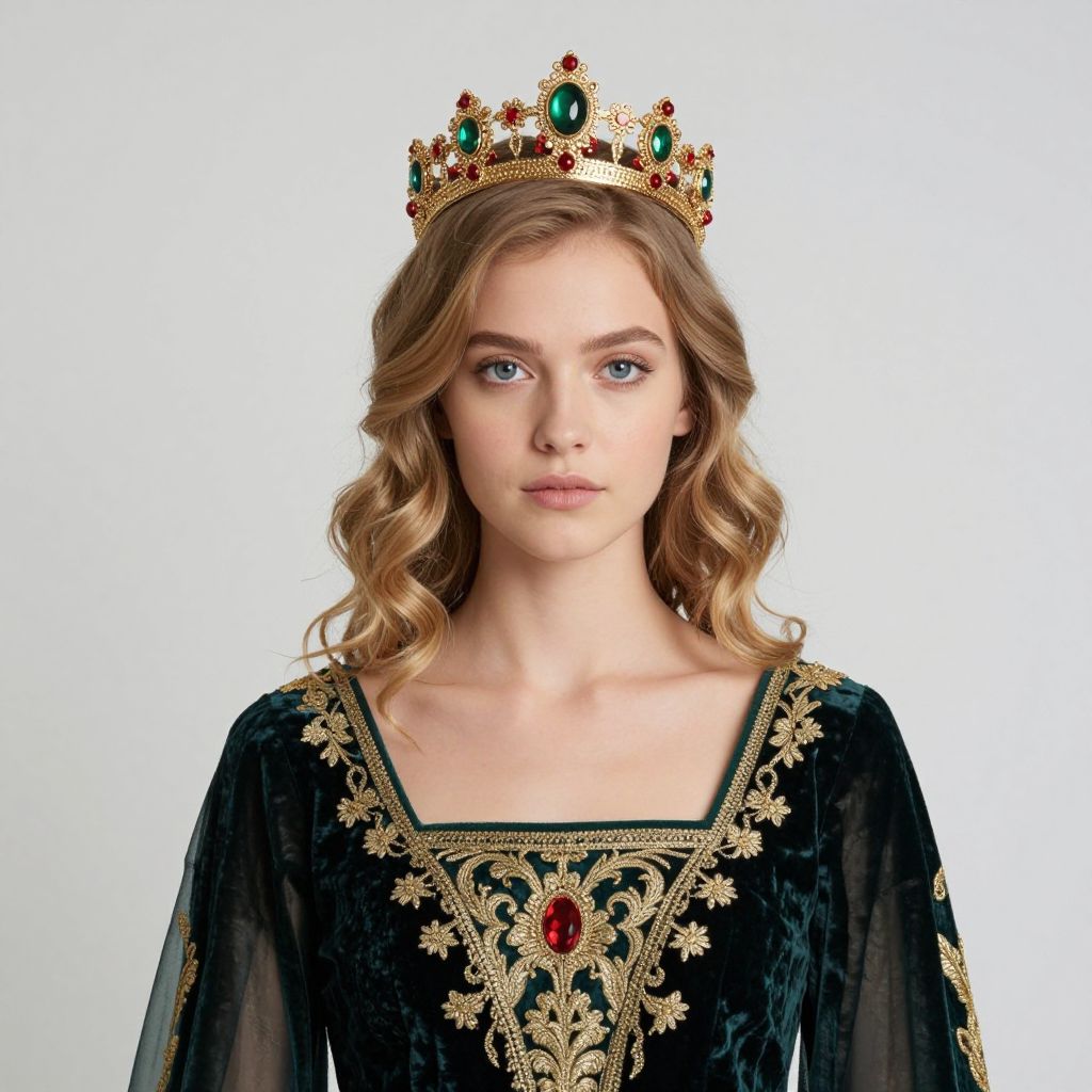 Photograph of a beautiful young woman with fair skin and wavy blonde hair, wearing a golden crown with green and red jewels. She has blue eyes and a neutral expression. She's dressed in an elegant, dark green velvet gown with intricate gold embroidery and sheer sleeves. The background is a plain, light gray, making her the focal point.