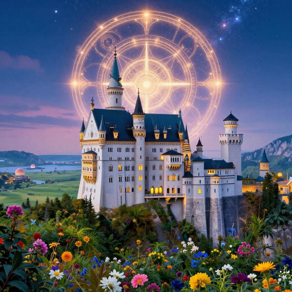 A majestic fantasy castle with tall spires stands on a hill surrounded by colorful flowers and lush greenery. The castle windows glow warmly against the backdrop of a vibrant, mystical sky with an intricate, glowing magical circle and starry night above mountainous terrain.