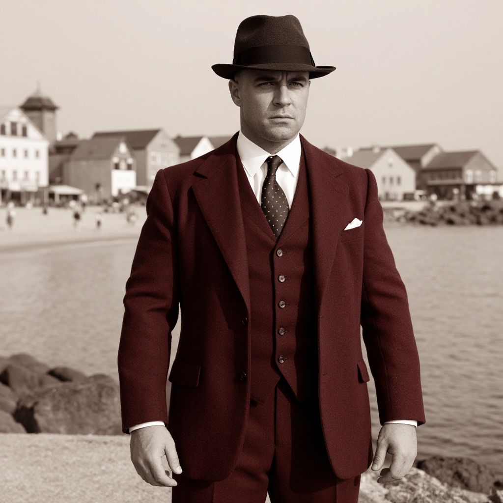 Sepia tone photograph of a muscular man dressed in a vintage 1940s style Oppenheimer-inspired outfit. He wears a tailored burgundy tweed suit with a matching vest, crisp white dress shirt, classic dotted tie, and a fedora hat. The background features a charming harbor beach with historic buildings and calm waters.