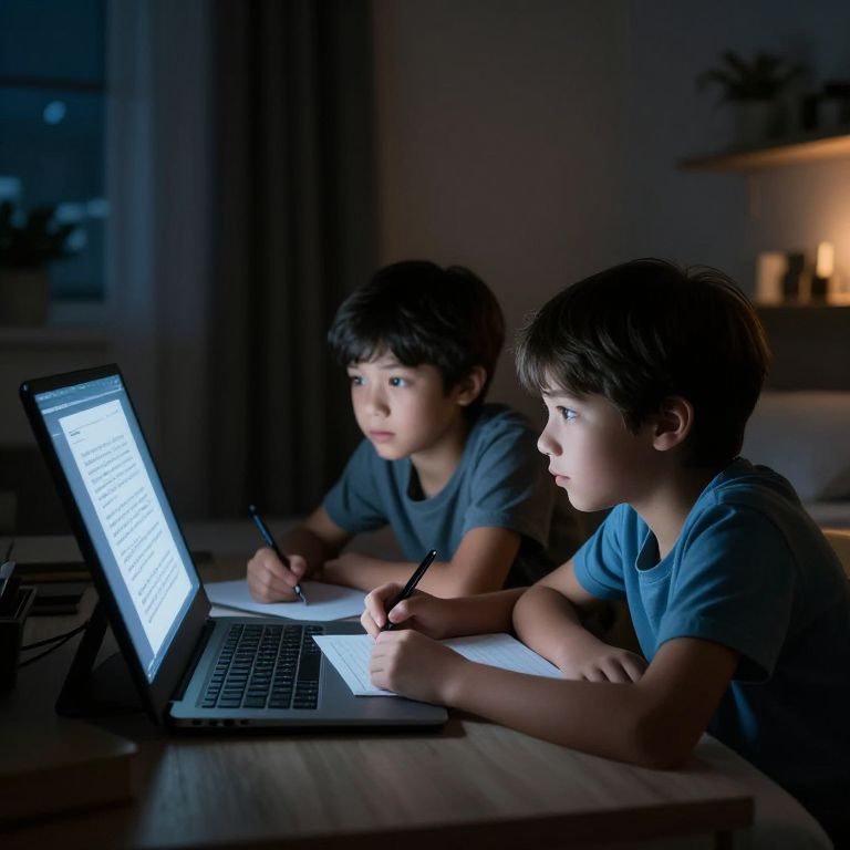 Photograph of two young boys, around 8-10 years old, with short dark brown hair, wearing blue t-shirts, sitting at a wooden table in a dimly lit room. Both boys are focused on a laptop displaying a white screen with text, and are writing on paper with pens. The background includes a blurred window with dark curtains and a shelf with candles, creating a cozy, evening atmosphere. The blue lighting from the laptop contrasts with the dark surroundings, highlighting their serious expressions and the laptop screen.