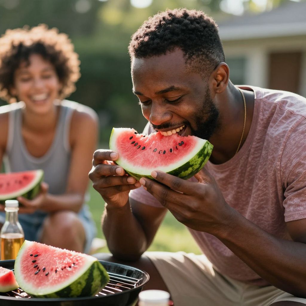 Black guy eating watermelon with friends at a backyard barbecue, warm sunlight, laughter and smiles, detailed watermelon seeds, festive and relaxed environment