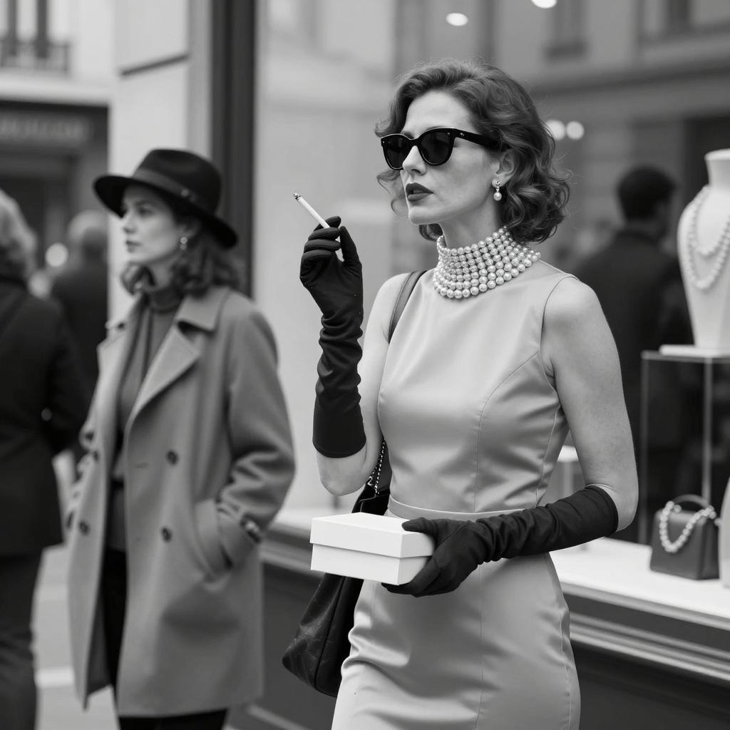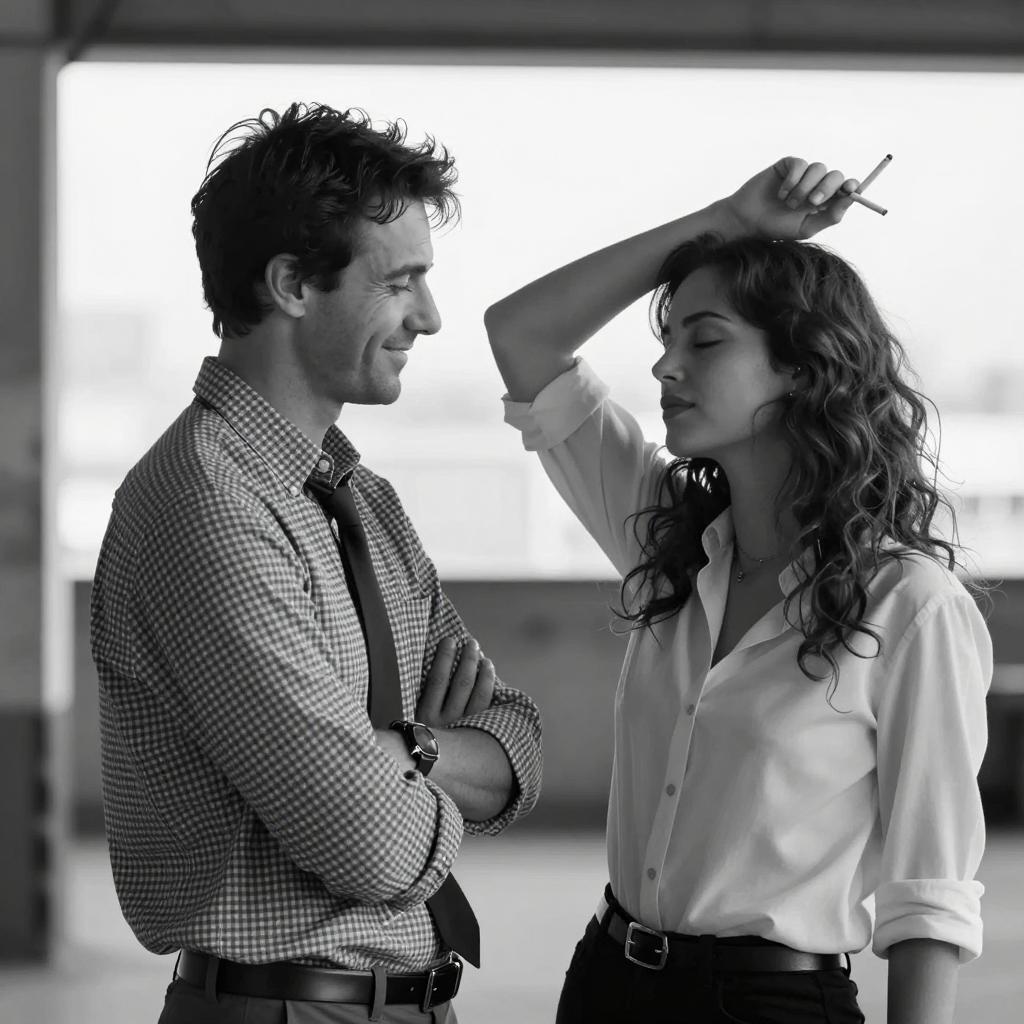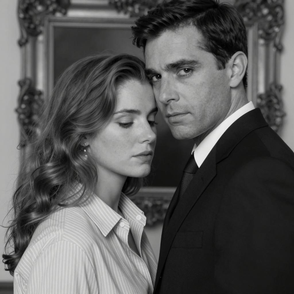 Black and white close-up portrait of a man and woman. The man wears a pinstriped suit, white shirt, dark tie, and a fedora hat, with a cigarette in his mouth. The woman has dark wavy hair, heavy eyeliner makeup, and a serious expression, wearing a dark blazer. The man's hand rests gently on the woman's shoulder, both showing intense and contemplative moods.