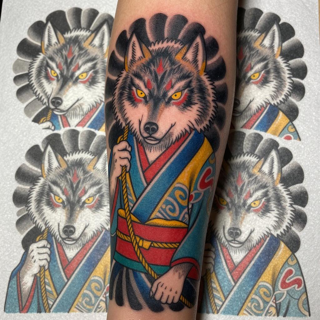 Tattoo on a forearm of a stylized, black tribal wolf with red and blue swirls on its back and tail. The wolf faces left with an elongated, flowing design. Pale skin background. Black fabric partially visible on the right.