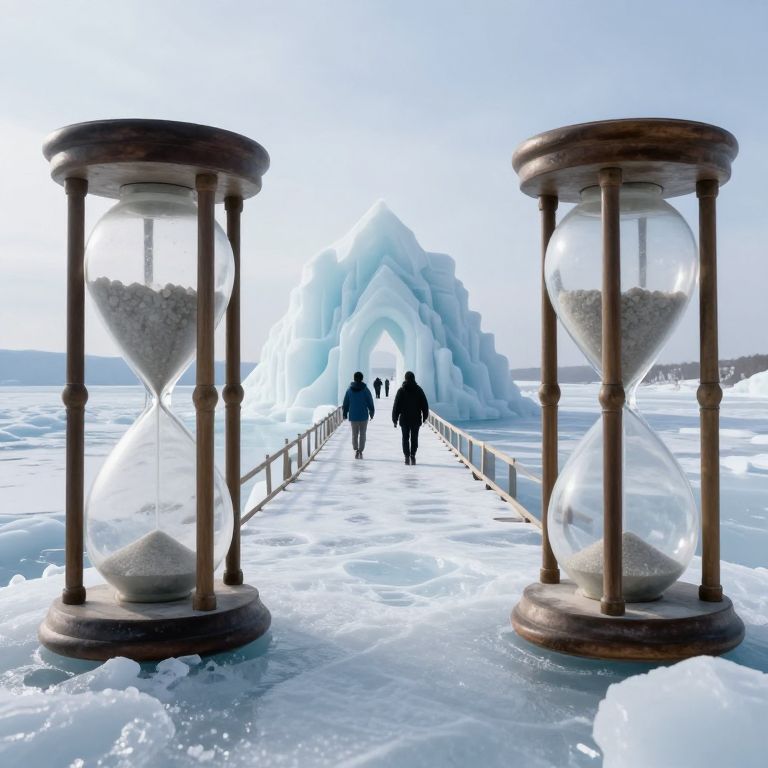 A bridge of whispering dry ice connects two crumbling hourglasses, leading travelers into the memory of a moment never lived.
