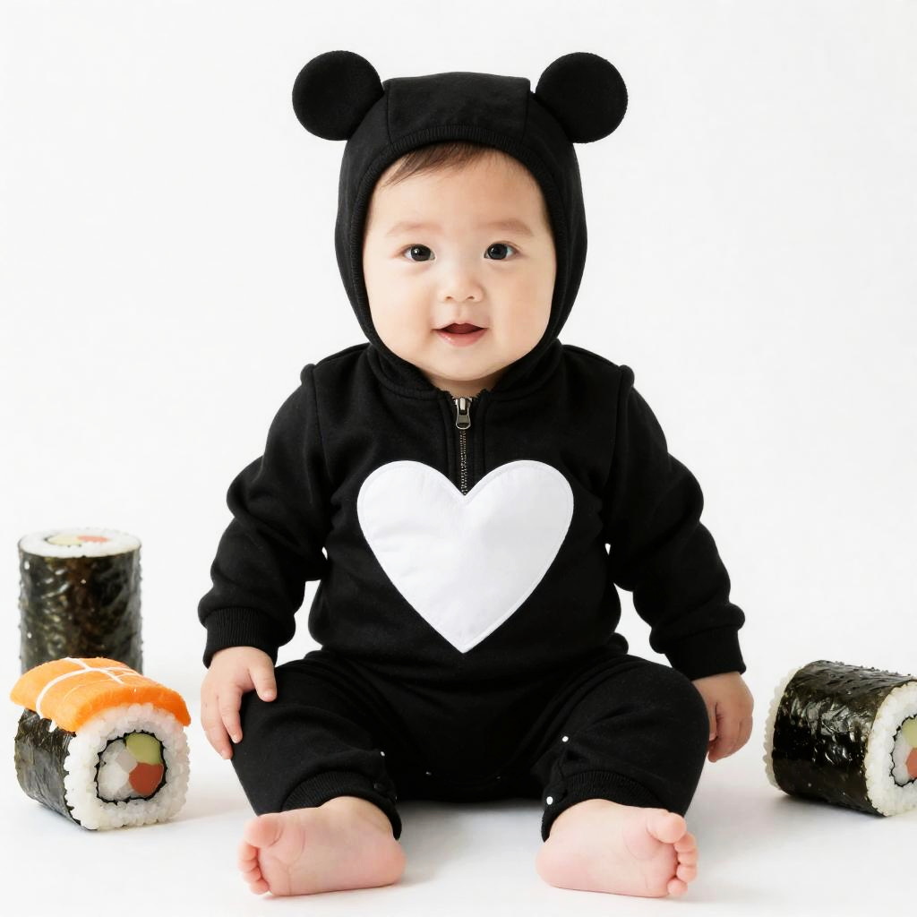 Adorable Asian baby dressed in a black hooded jumpsuit with mouse ears and a white heart on the chest, sitting barefoot on a white background. Surrounding the baby are large sushi rolls, emphasizing the sushi roll toddler costume theme.