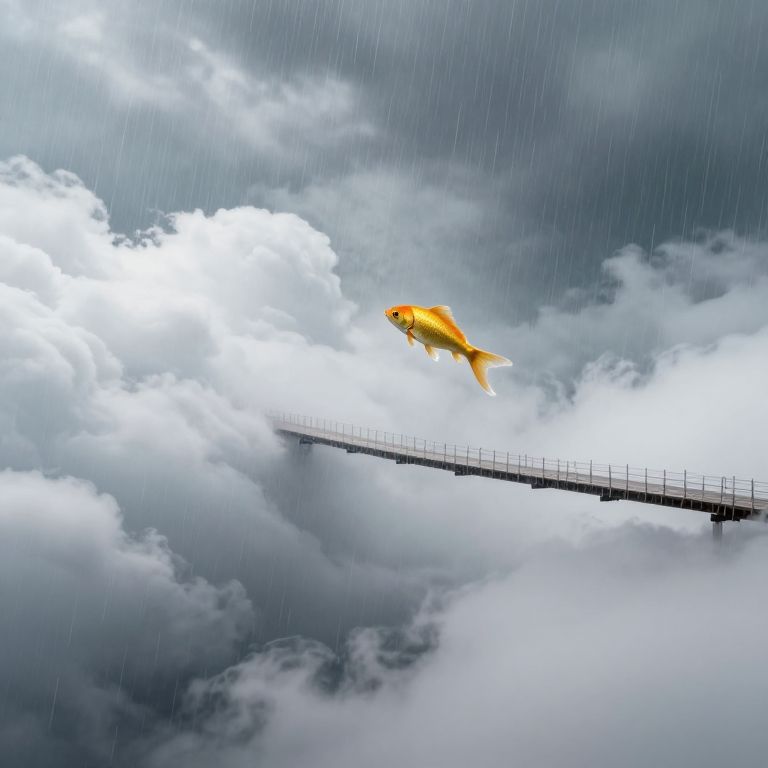Amidst a dreamlike expanse of floating clouds and ethereal rain, a golden fish soars with a sense of boundless freedom, weaving an otherworldly bridge that symbolizes the delicate balance between the terrestrial and celestial realms, evoking a profound sense of wonder and transcendence.