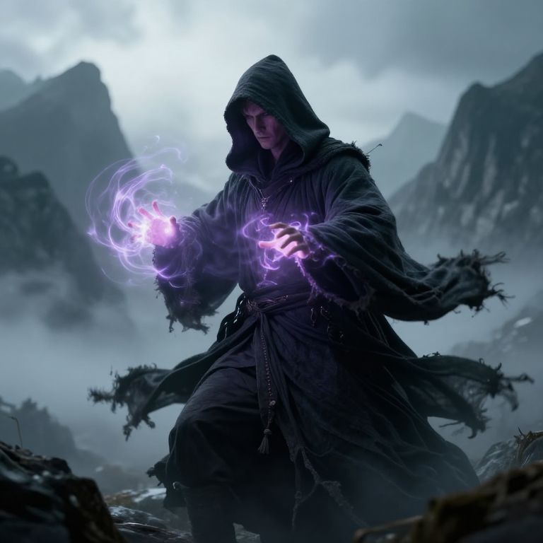 Digital fantasy artwork of a hooded, dark-robed sorcerer conjuring purple lightning in a misty, mountainous landscape. The sorcerer's