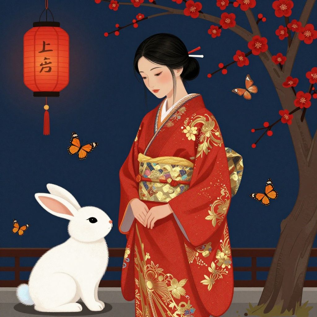 Digital artwork of a black-haired Japanese woman in a red floral kimono, standing beside a white rabbit under a lantern-lit night sky with red cherry