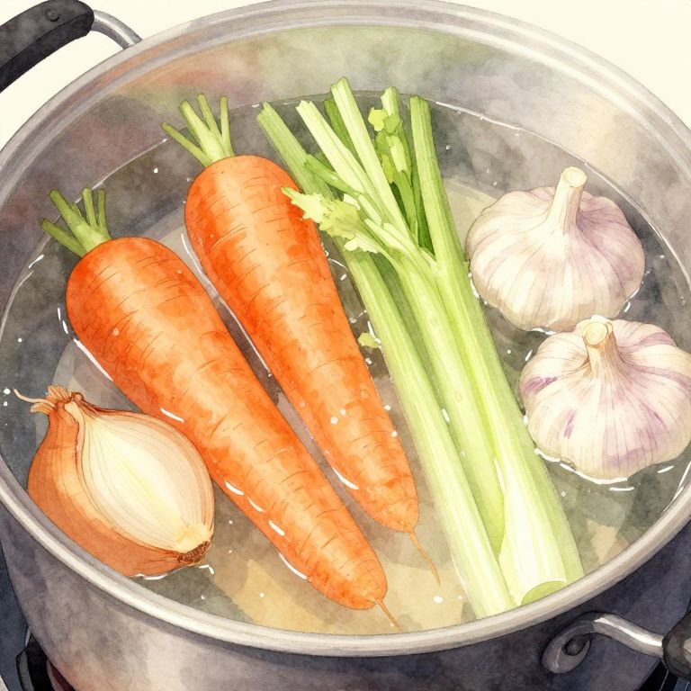 Artistic watercolor illustration of common broth ingredients including two whole carrots, celery stalks, a whole onion, and two garlic bulbs simmering in a pot with water. The image features soft pastel colors and a warm, comforting mood evoking homemade cooking and traditional culinary preparation.
