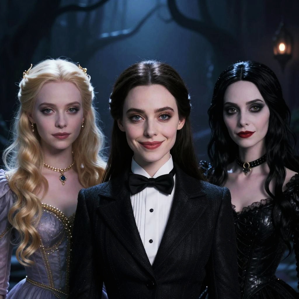 Photograph of three women in Gothic fairy-tale attire: blonde with long curls, central brunette in black tuxedo, and dark-haired woman in