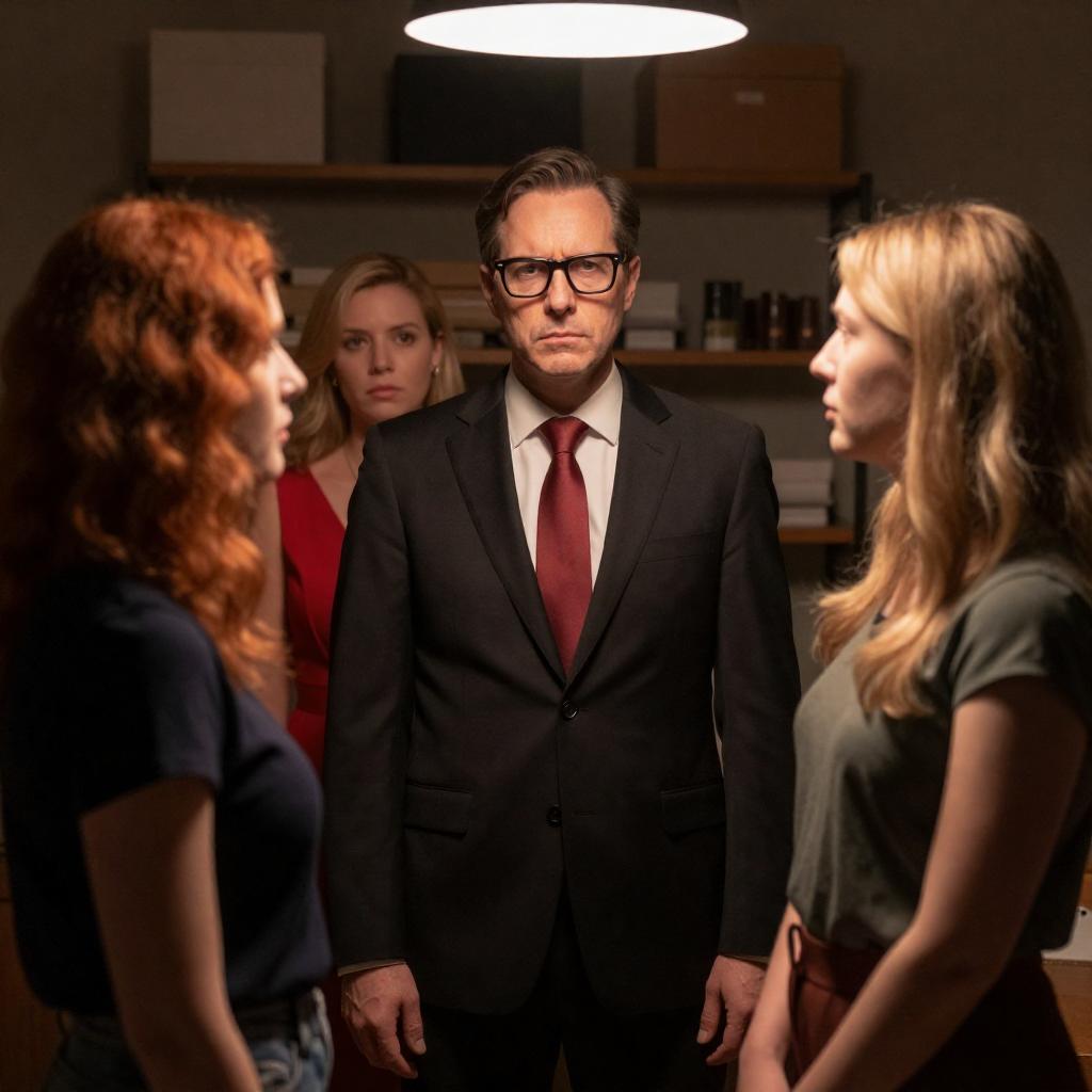 Photograph of three people in a dimly lit office. Blonde woman in green suit, face turned away, leaning on middle-aged man with glasses and red tie, who gestures with right hand. Woman with curly brown hair, black shirt, and headset, holding clipboard, stands to the right. Background includes shelves with books and equipment. Intense expressions on faces.