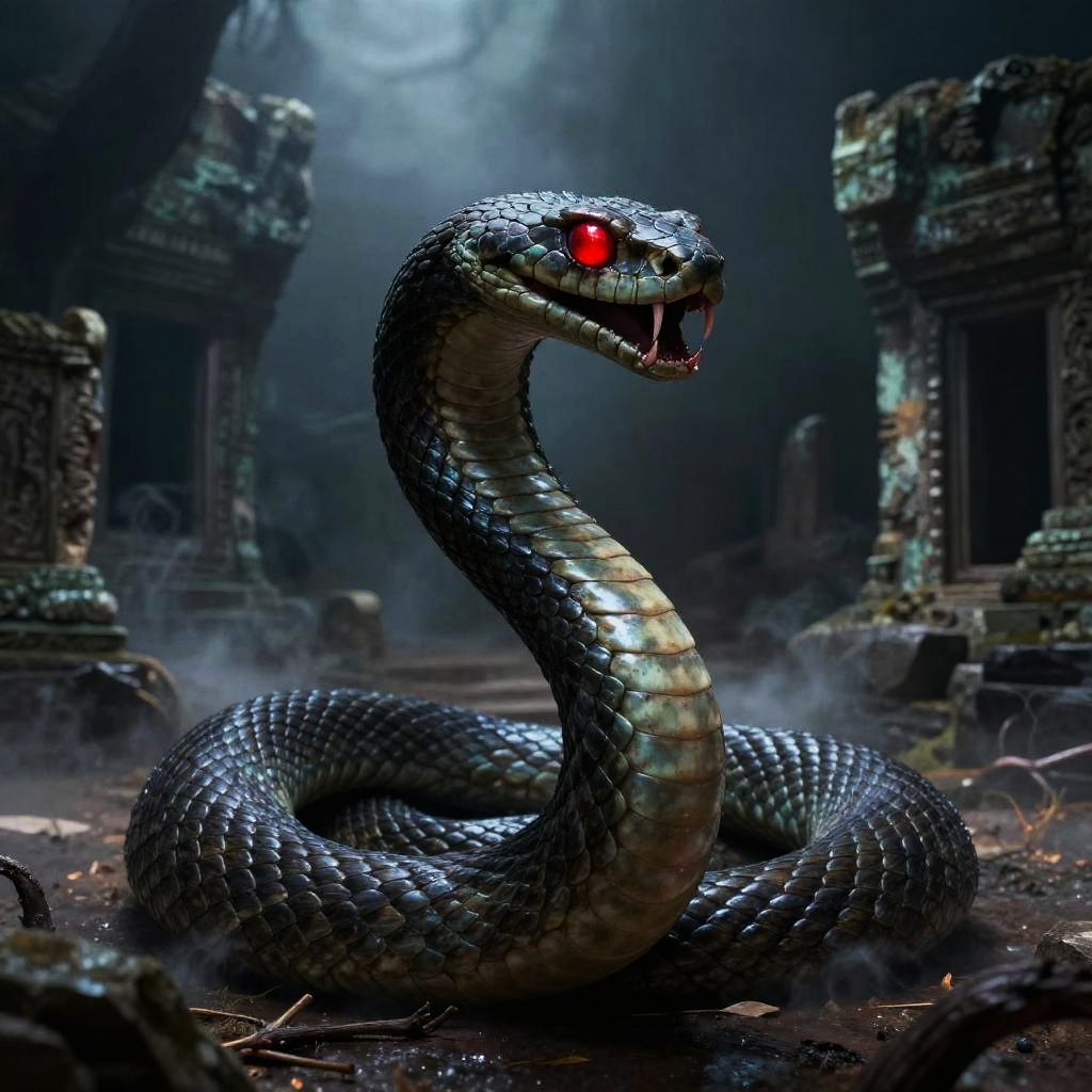 Demonic snake coiled around ancient ruins, glowing red eyes, dark mist swirling, ominous atmosphere, detailed scales and fangs, fantasy horror style