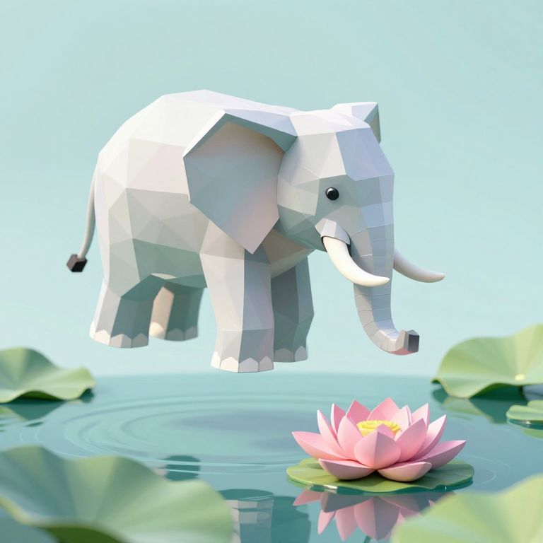 A geometrically rendered elephant, crafted in a low-poly 3D style, gracefully hovers above a serene lotus pond, its translucent form casting subtle shadows as it interacts with a delicate pink lotus flower floating on the water's surface.