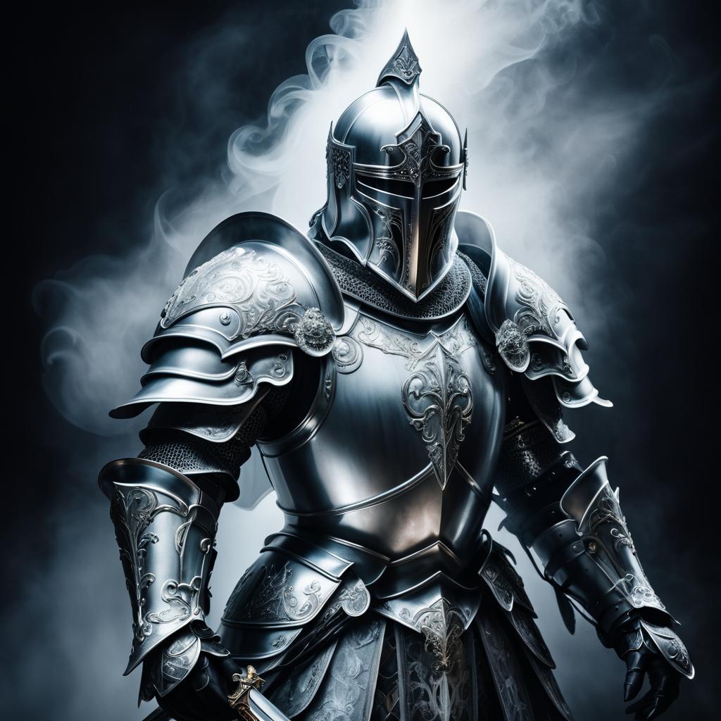 Portrait of a ghostly knight made of ethereal mist with ornate silver armor, dramatic lighting.