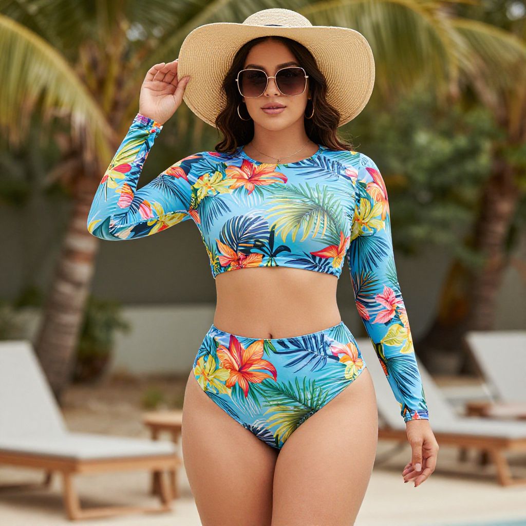 Full body shot, Pear-shaped body type woman, long sleeve bikini top, high neck design, soft stretchy fabric, vibrant tropical print, matching high-waisted bikini bottom, seamless edges, lightweight quick-dry material, sporty yet stylish, sun protection feature, fitted silhouette, comfortable and flattering, perfect for beach or poolside, accessorized with oversized sunglasses, wide-brimmed straw hat, minimalistic gold jewelry, relaxed summer vibe Sexy. Pretty face and beаutiful eyes. Big breasts