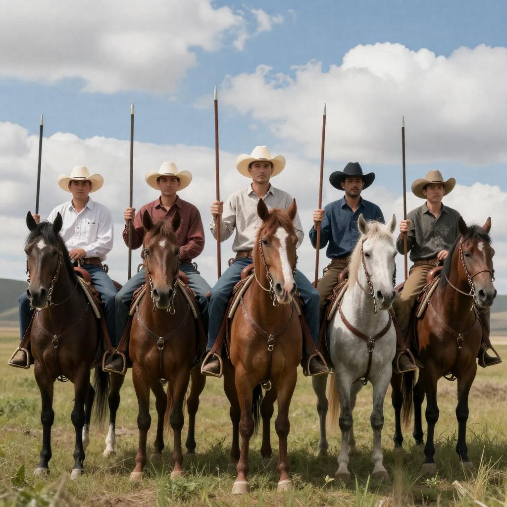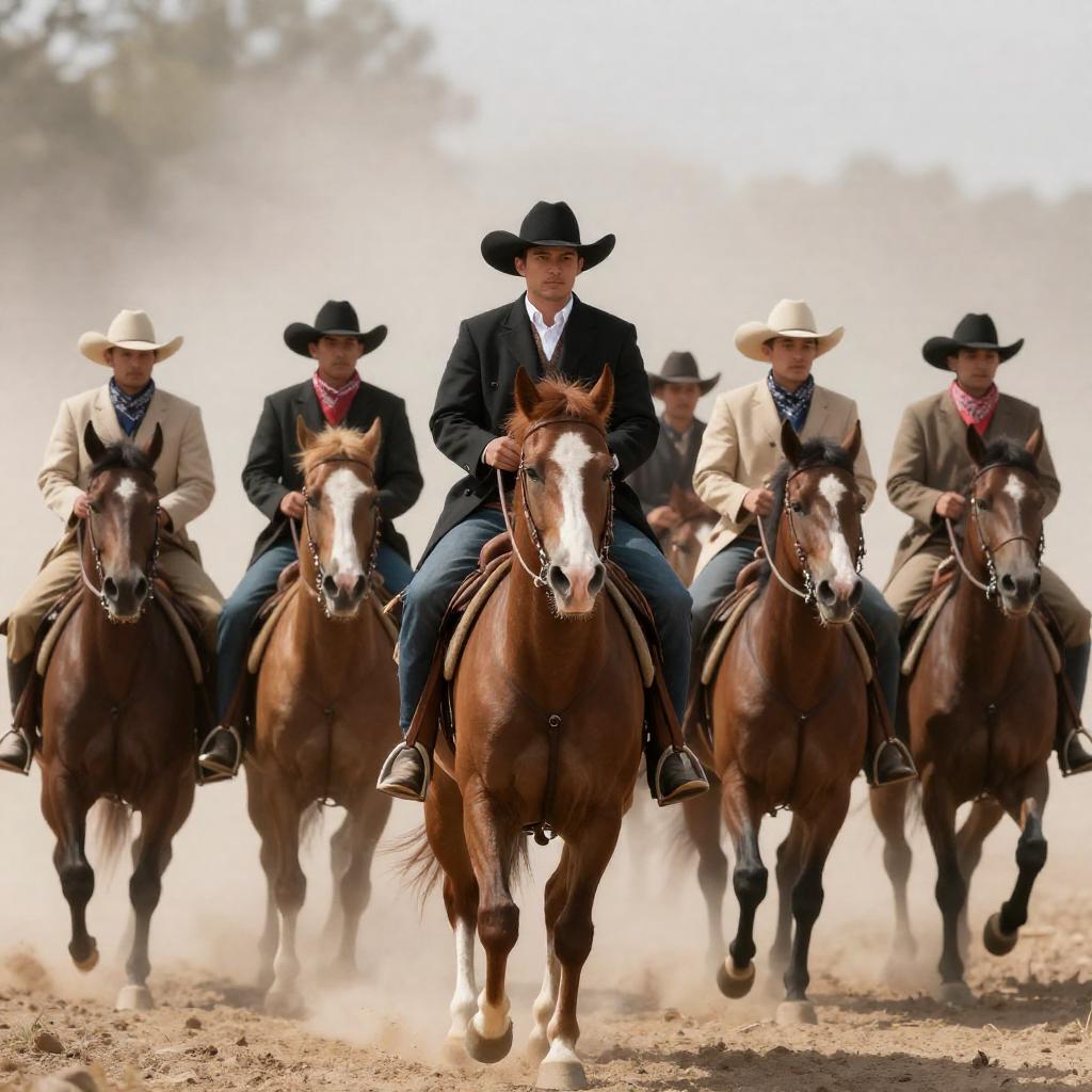 Photograph of seven cowboys on horses, centered on a man in a black coat and wide-brimmed hat, leading. Other cowboys wear brown and beige outfits, some with bandanas. Dust cloud in background. Horses in mid-gallop, faces focused.